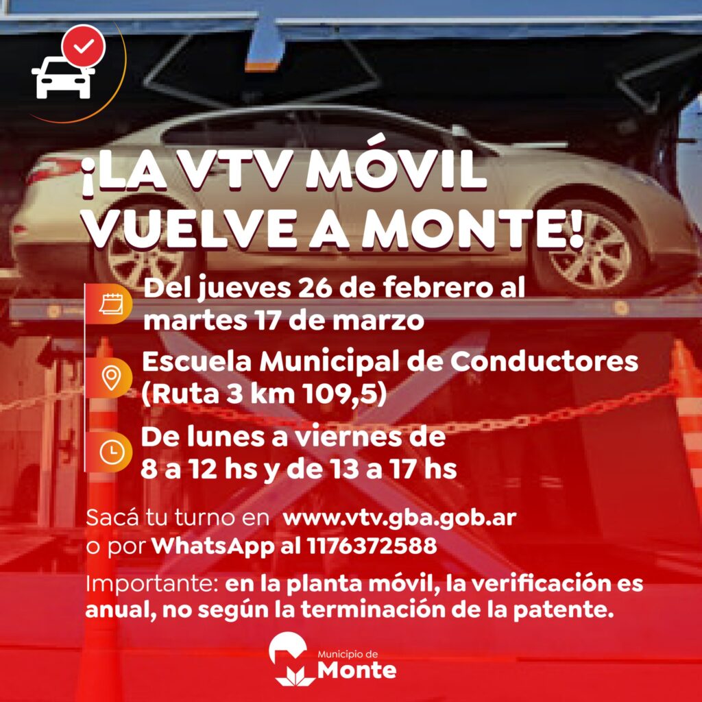 ¿Cuándo y dónde estará la VTV móvil? Lunes a viernes de 8 a 12hs y de 13 a 17hs Escuela Municipal de Conductores (Ruta 3 km 109,5)